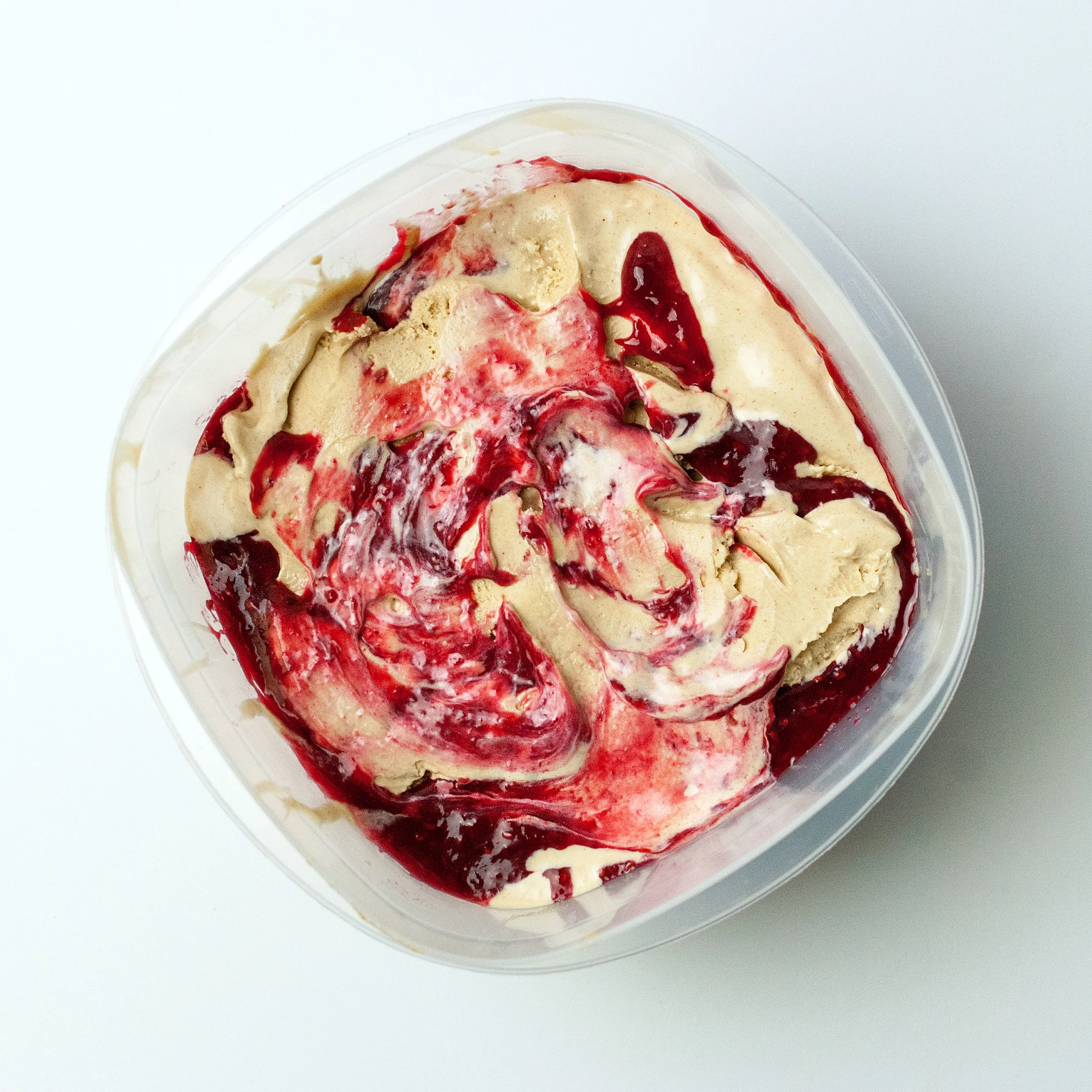 When the ice cream resembles thick soft serve, turn off the ice cream maker and dump it into a large container for freezing. Ladle in spoon-fulls of the homemade ice cream into the container while ribboning your jam of choice over the top of it in layers. Be sure to do this process as quickly as you can so that your just churned ice cream doesn’t melt. Spread the jam out in a fashion that it would create a balance scoop as consistently as possible; not too much and not too little anywhere, and be sure to put a little bit of jam on top to make a good first scoop when it’s finally ready! After it’s all in the container, cover the ice cream in a layer of plastic wrap, followed by the lid, then pop it in the freezer for at least 4 hours, although overnight seems to work best when we make ice cream.