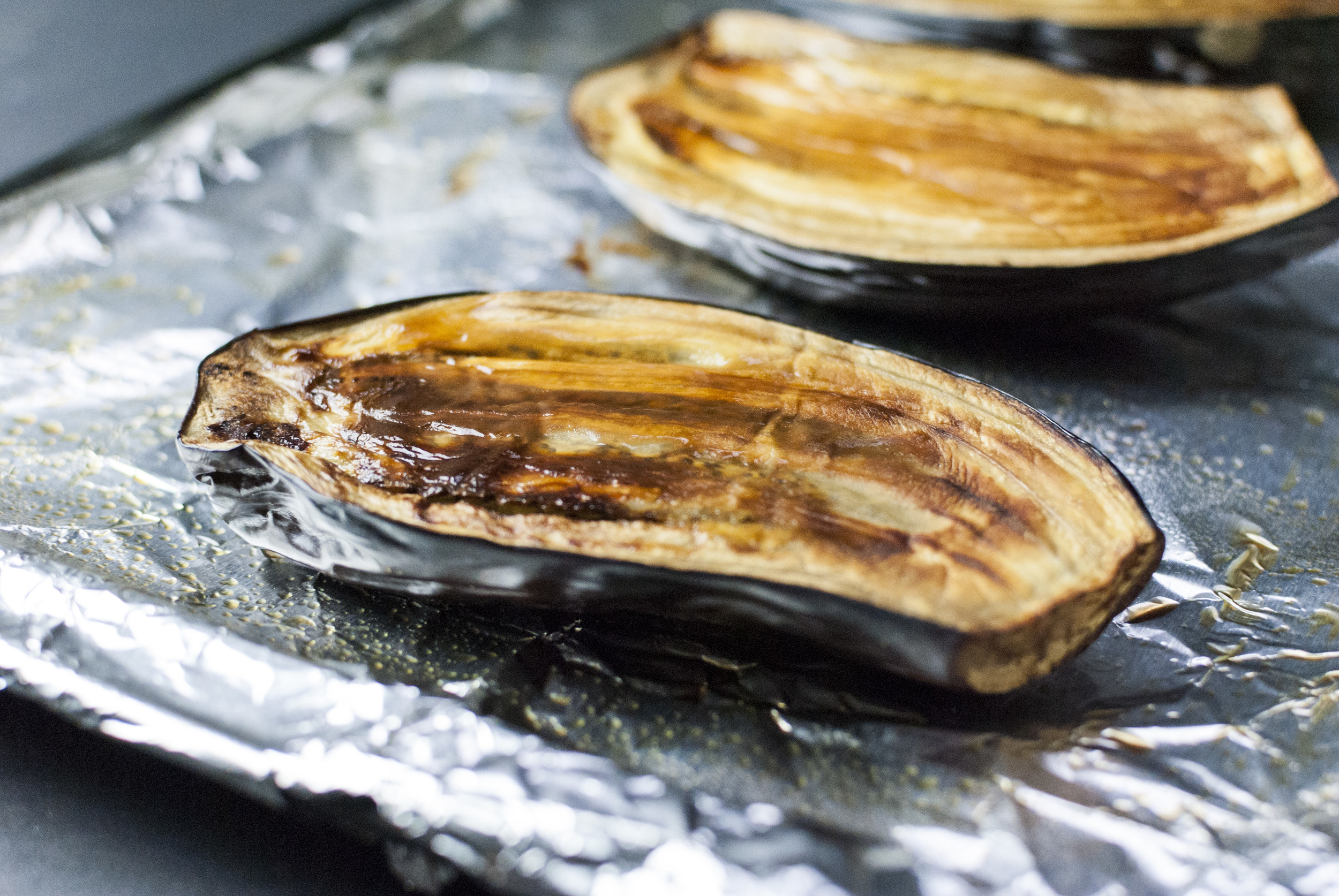 Preheat oven to 350°F. Cover a baking sheet in aluminum foil then lightly oil the surface. Roast the eggplant on the baking sheet skin side up for about 2 hours or until the flesh of the eggplant is very tender.